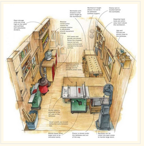 - You'll get ideas and layouts for all sizes of workshops,from the large to tiny including setting up a woodworking shop in your garage, basement, attics, home spaces, apartment corners and more.